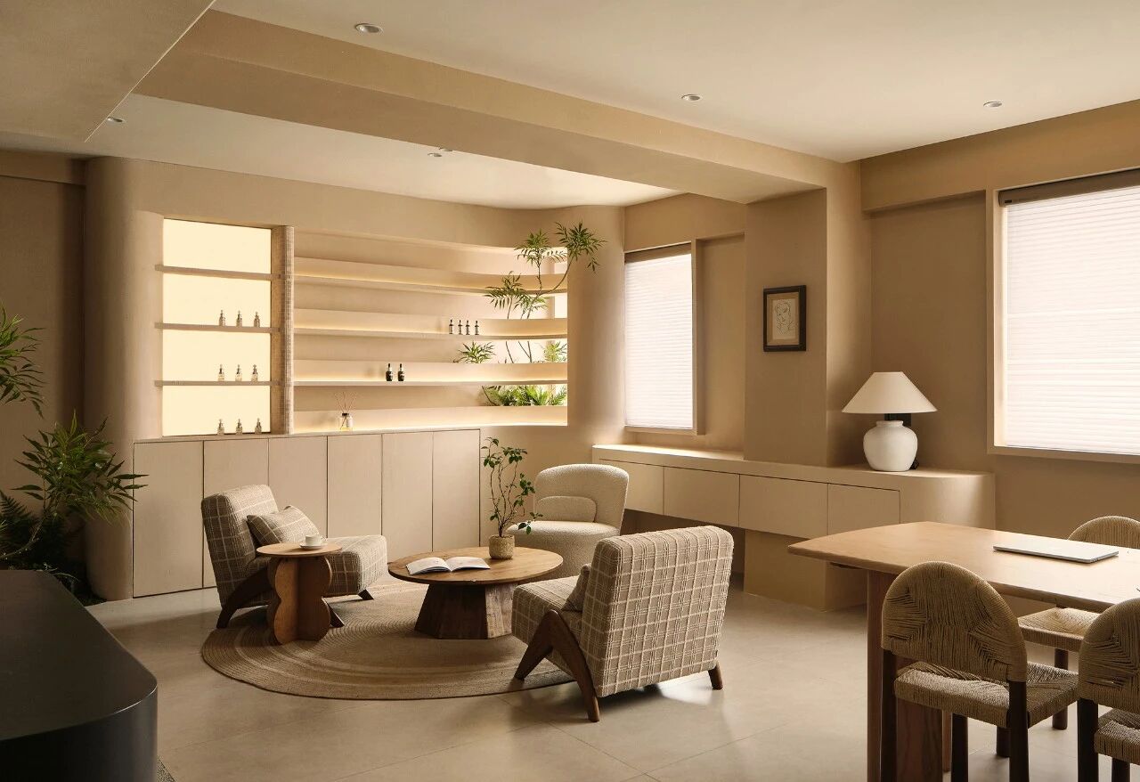 这个空间坐落于大楼顶层,拥有得天独厚的自然优势——极好的采光和迷人的风景。阳光如同金色的丝线,从天空倾洒而下,为整个空间披上一层温暖而柔和的光辉。而设计师更是独具匠心,将位于转角的窗户纳入产品区的设计之中,并在其后精心布置绿植。